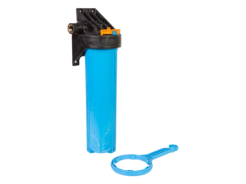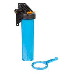 Типоразмер колбы - BigBlue20”. Поворот коллектора на 180° позволяет установить корпус фильтра в магистраль, с направлением движения воды, как слева направо, так и справа налево.Магистральную трубу можно разместить вплотную к стене.