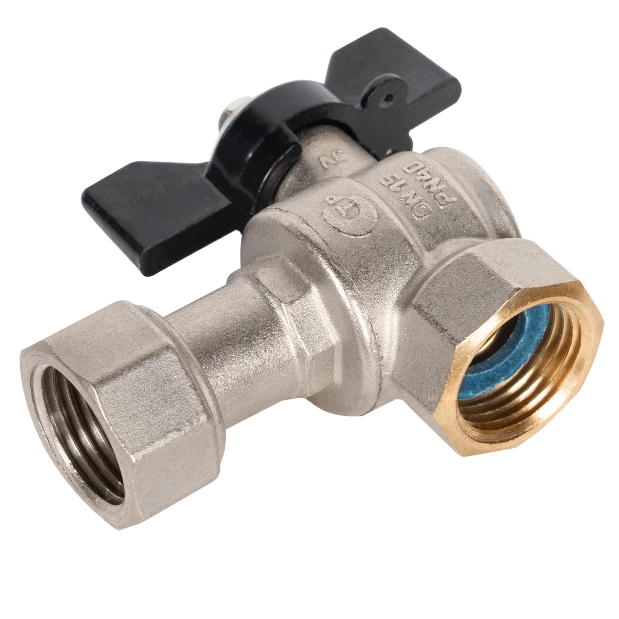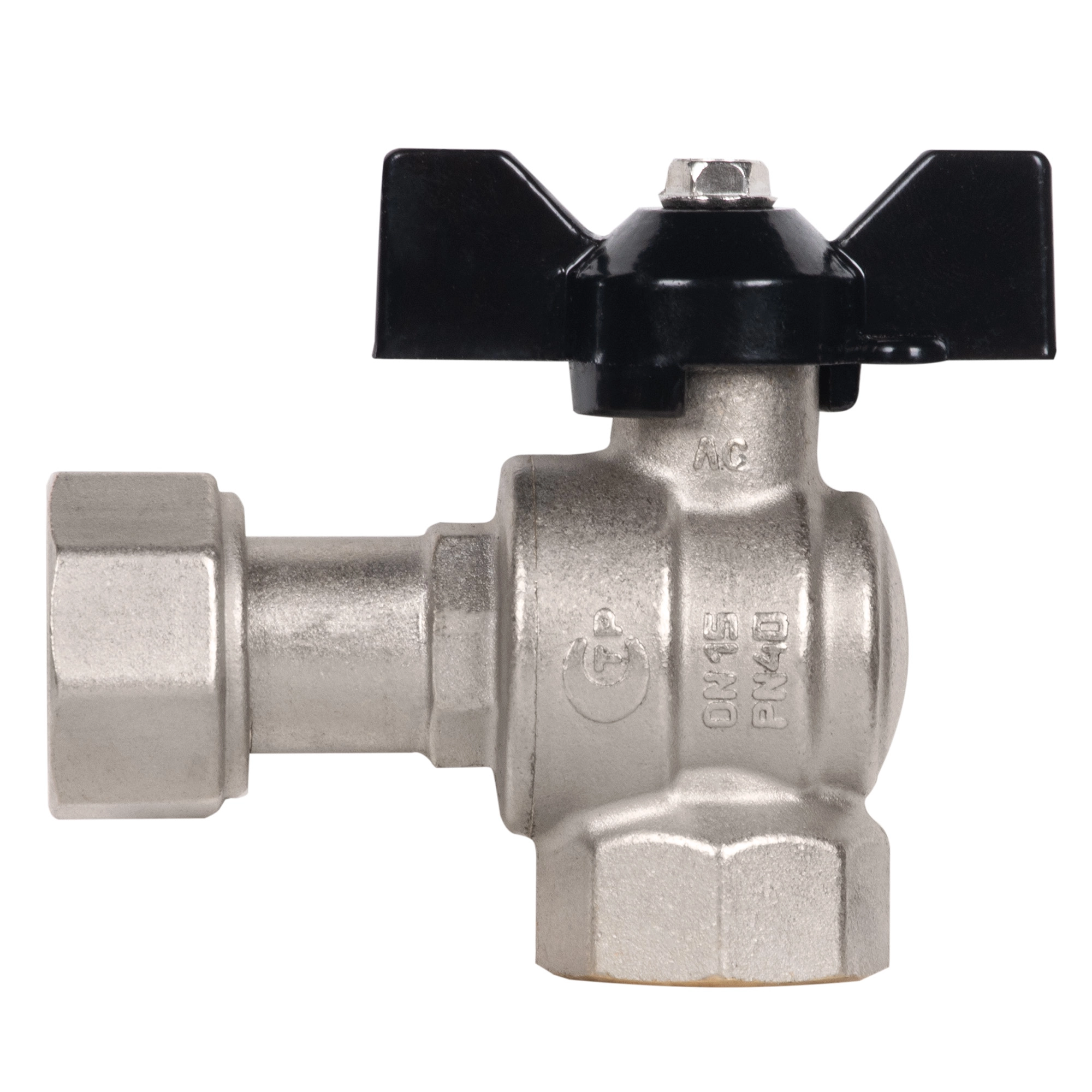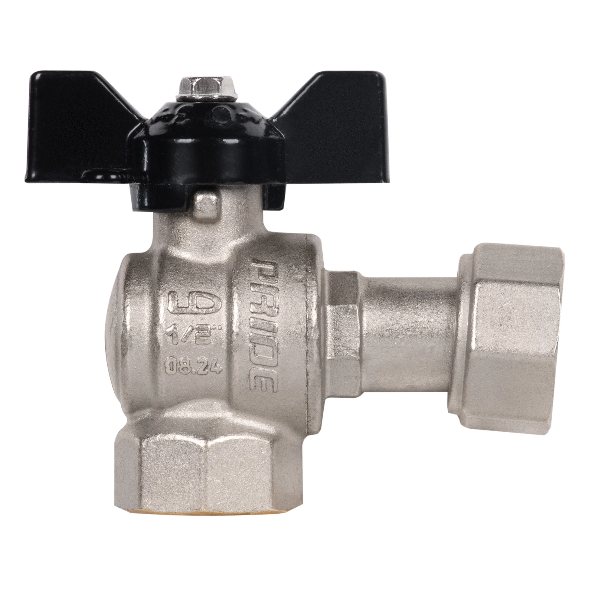 Кран шаровой латунный LD Pride 47.15.В-НкГк.У.Б Ду15 Ру40 угловой, с накидной гайкой (бабочка)