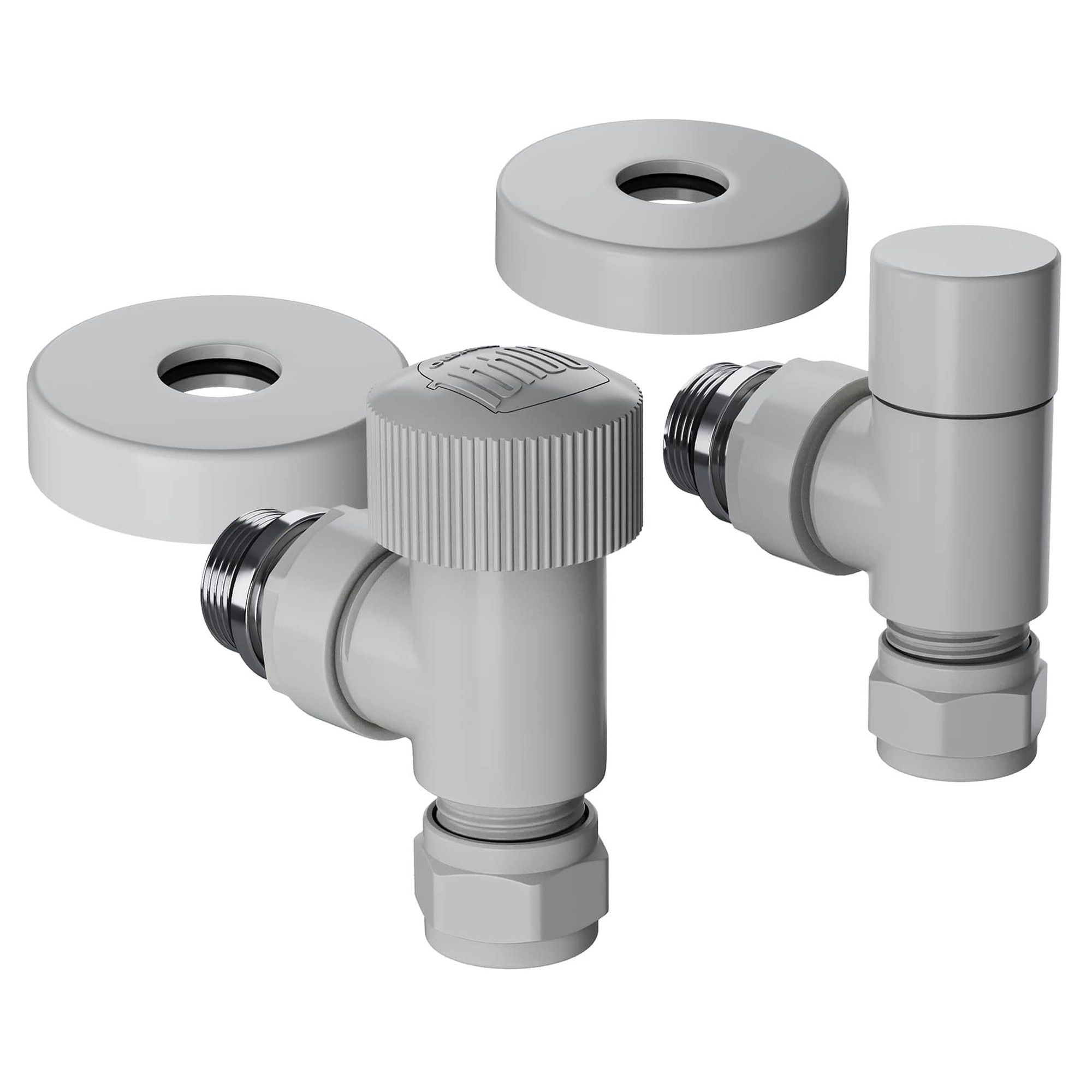 Термостатические наборы серии Design Pro поставляется в необходимой для чистового монтажа комплектации: клапан термостатический для установки на подающий трубопровод, запорный клапан для установки на обратный трубопровод, 2 гайки-фитинга для подключения клапанов к монтажной трубке 15 мм и 2 цельных латунных отражателя с внутренним резиновым уплотнением внутренним диаметром 15,2 мм.