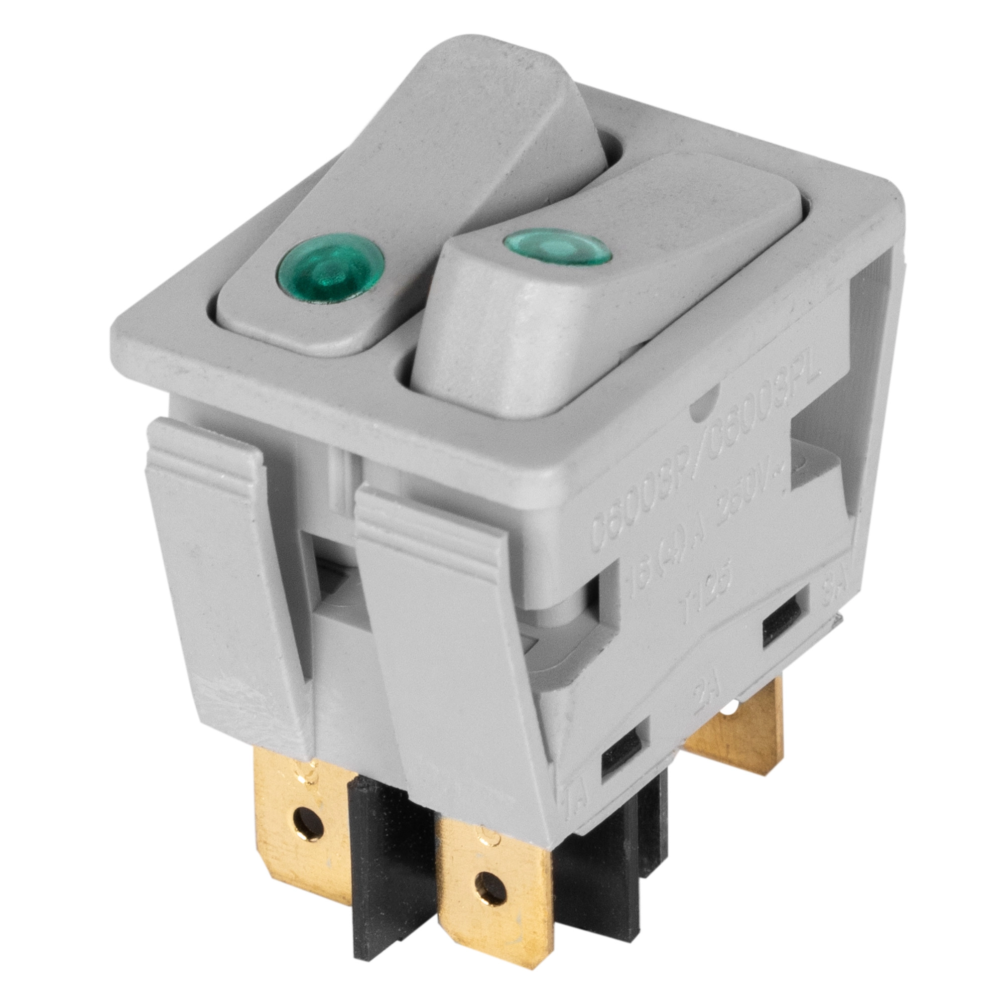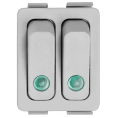 Серый двухклавишный выключатель для обогревателей. Выключатель сдвоенный идеально справляется с нагрузкой до 16 А при напряжении 250 В, что гарантирует его эффективность и безопасность в использовании.