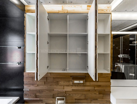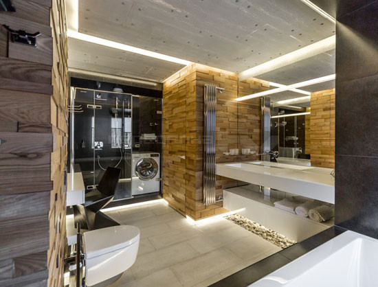 Основной акцент при декорировании пространства был сделан на игре фактур и света. Дизайнер предложил использовать инновационные, насыщенные оптоволокном, светопроницаемые бетонные панели, через которые проникает свет и получается необычное фактурное свечение. Декоративное освещение в ванной комнате разместили скрыто, благодаря чему все пространство получило дополнительную футуристическую подсветку.