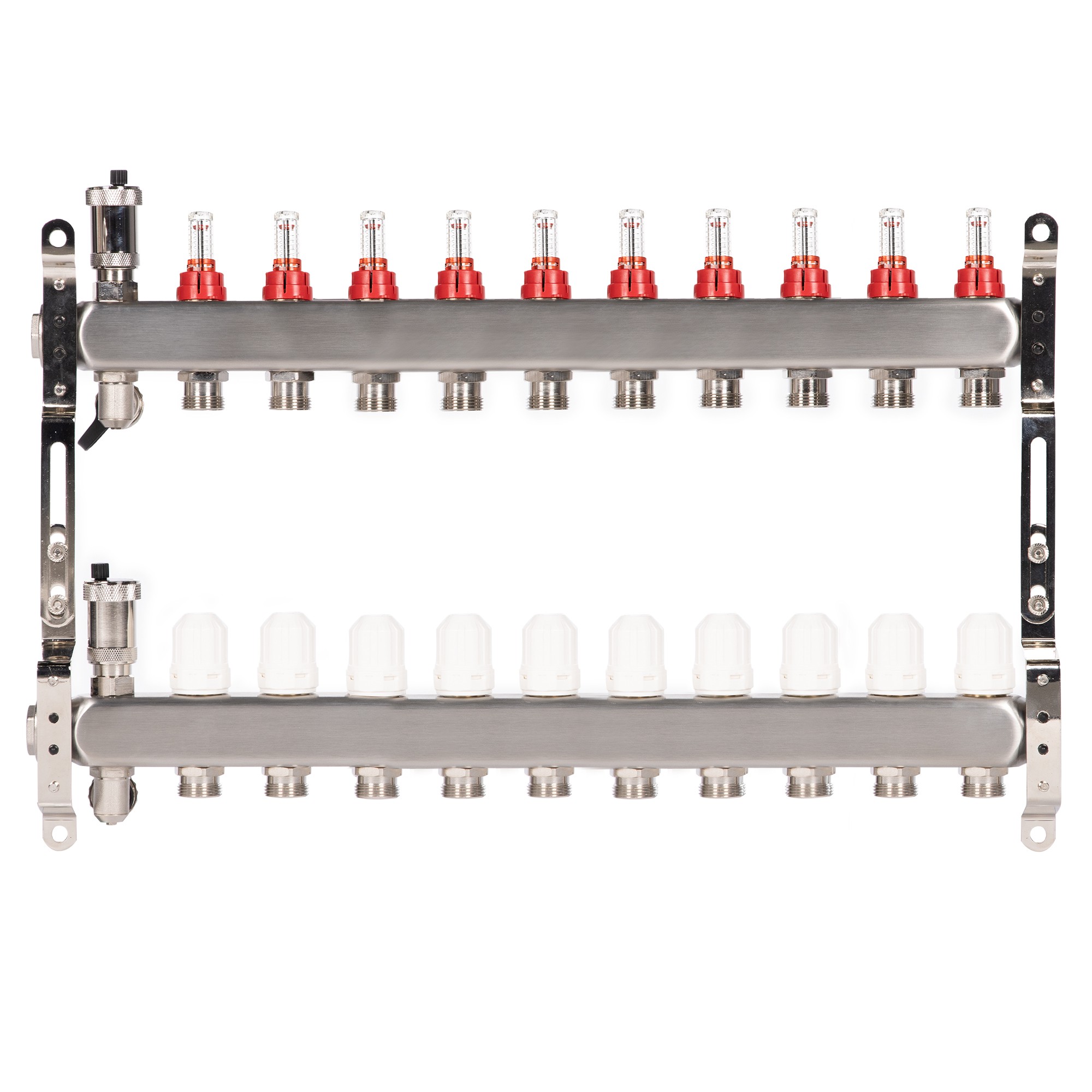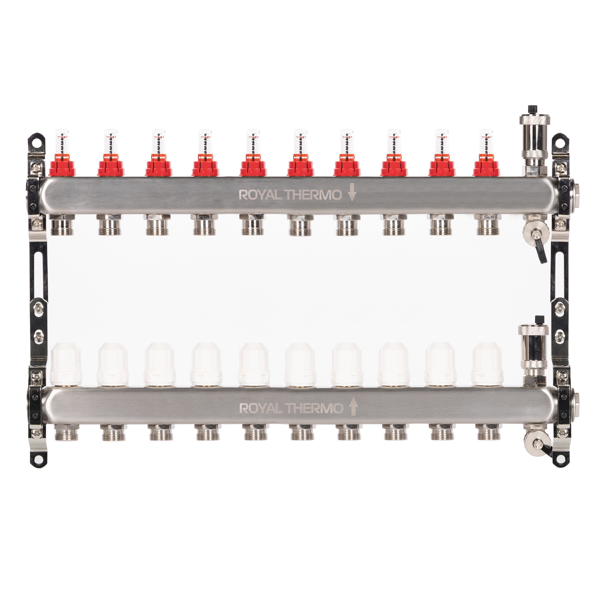 Коллекторы Royal Thermo поступают в сборе и включают подающий и обратный коллекторы, регулировочные вентили с встроенными расходомерами, термостатические вентили с возможностью установки сервопривода, воздухоотводчики и сливные краны и заглушки.