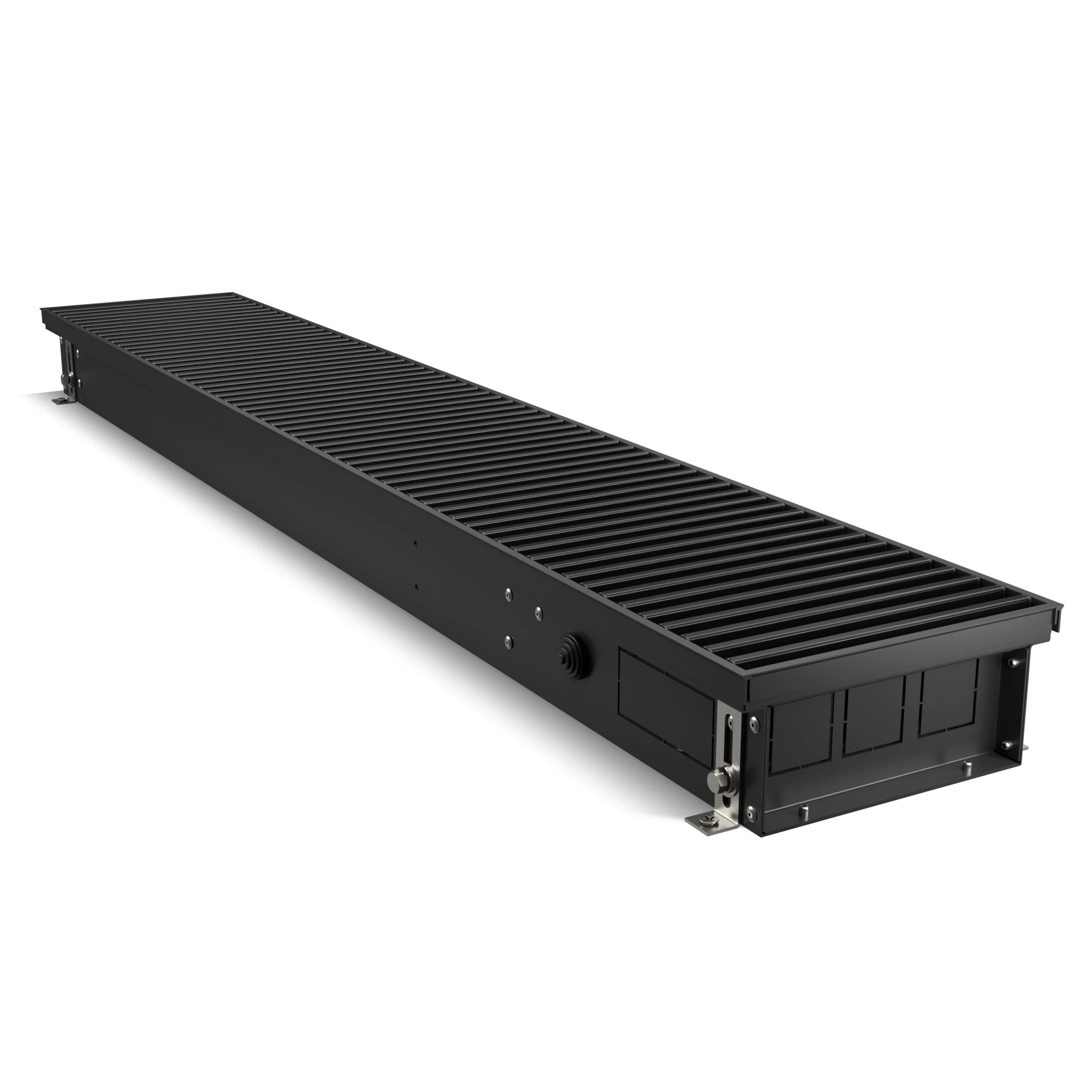 Корпус окрашен шагреневой краской AkzoNobel фирменного черного цвета Noir Sable. В такой же цвет окрашен теплообменник. Темная окраска корпуса изнутри и декоративные крышки, защищающие зону подключения и зону калача от попадания пыли и мусора, визуально скрывают внутреннюю часть, благодаря чему конвектор эстетично смотрится в интерьере.