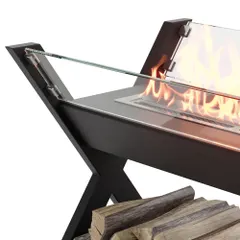 Биокамин представляет собой сборную напольную модель оригинального дизайна из закаленного прозрачного стекла и топливного блока на подиуме. С деревянными натуральными накладками и набором дров с дровницей, обработанных огнебиозащитным средством.
