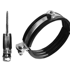 Металлический оцинкованный хомут для труб с резиновой прокладкой, болтом и дюбелем — это специальный крепежный элемент, используемый для надежной фиксации труб по различным направлениям.