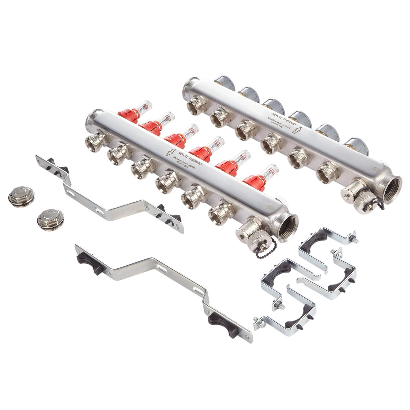 Коллектор Royal Thermo нерж. в сборе с расходомерами 1" ВР-3/4" НР с автомат.воздухоотвод-ми 10 вых.