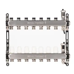 Универсальный коллектор из нержавеющей стали Royal Thermo предназначен для распределения теплоносителя в системах отопления и водяного теплого пола.