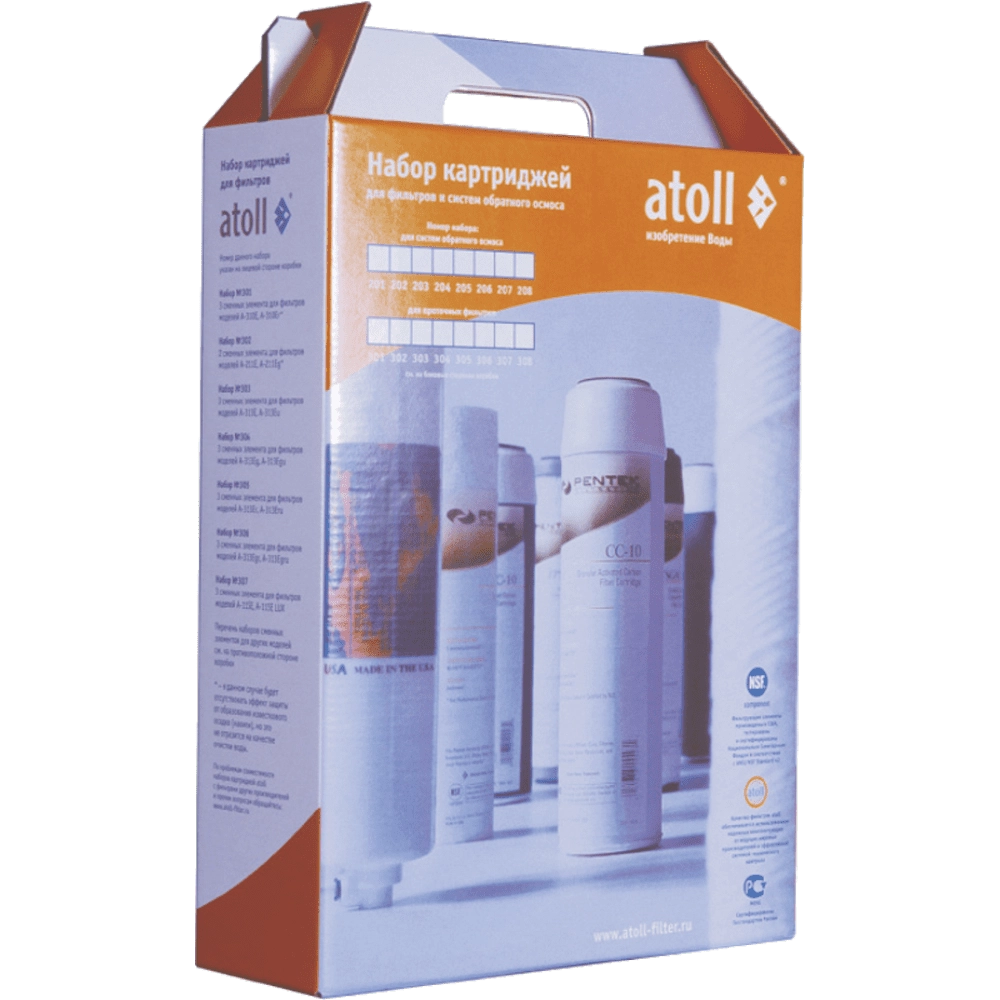 Набор картриджей atoll №202 STDA — это комплект оригинальных расходных материалов для систем обратного осмоса. Срок службы зависит от условий использования и качества входящей воды, рекомендуемая периодичность замены — каждые 6 месяцев.