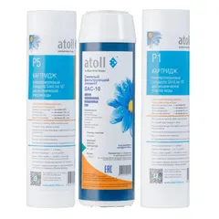 • очистки от органических примесей — atoll GAC-10. Гранулированный активированный уголь удаляет из воды хлор, неприятные запахи, улучшает органолептические качества воды. Имеет встроенный постфильтр, дополнительно удаляющий примеси >20 мкм;