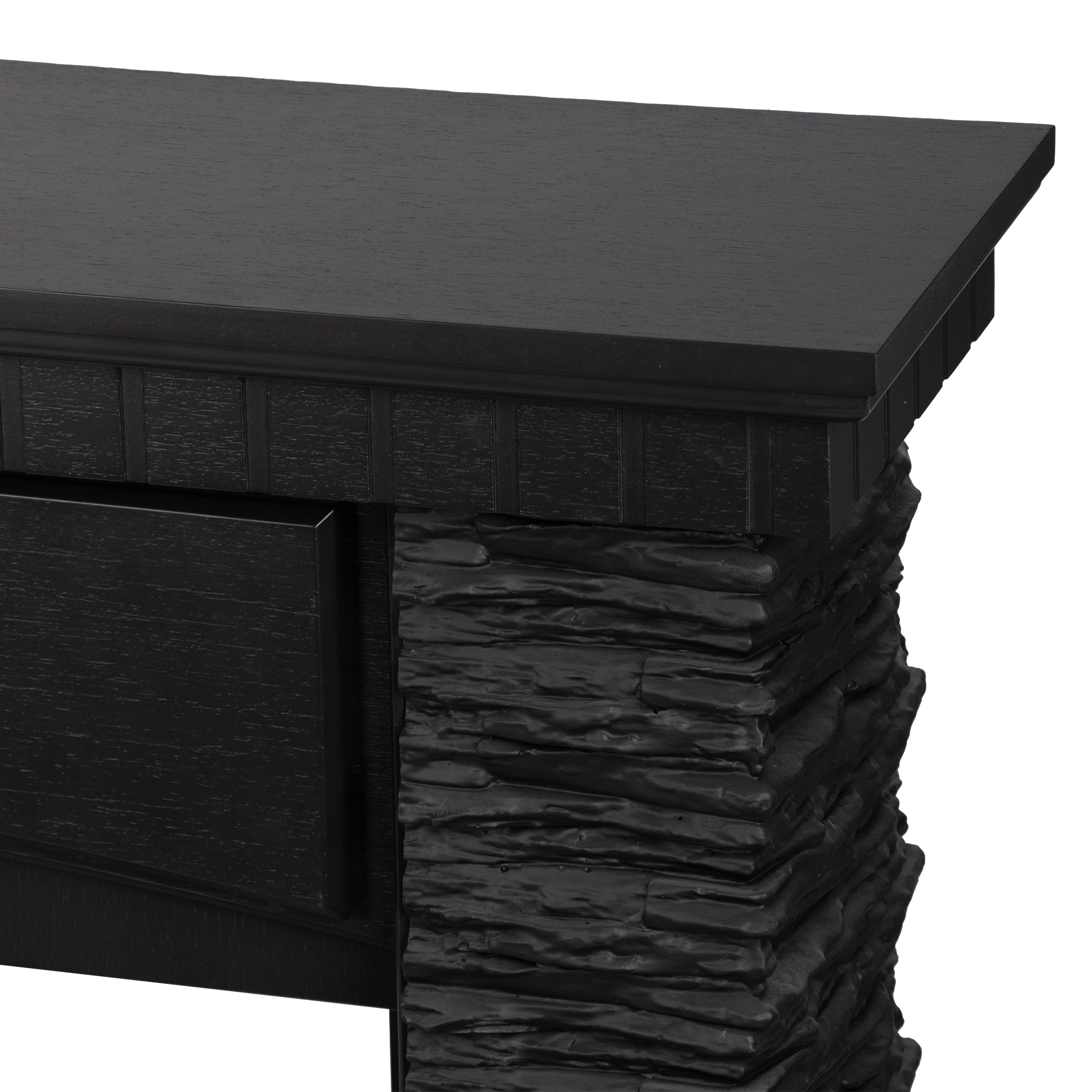 Портал выполнен в современном стиле и предназначен для линейного электрического очага Royal Thermo Aurora RTFP/P-AR40LS. Основной материал отделки - черный скалистый камень, создающий выразительную фактуру и придающий конструкции эффект монолитности и благородной массивности. Поверхность камня имеет легкий природный рельеф с матовым блеском, который красиво подчеркивает игру света от пламени очага. Основные и боковые стойки облицованы декоративным камнем с фактурой скалистых пластов. Центральная ниша рассчитана под линейный очаг - вытянутой горизонтальной формы, что визуально расширяет пространство и придает интерьеру динамику. Столешница выполнена из МДФ, покрытого натуральным шпоном дуба создает сбалансированный визуальный акцент.