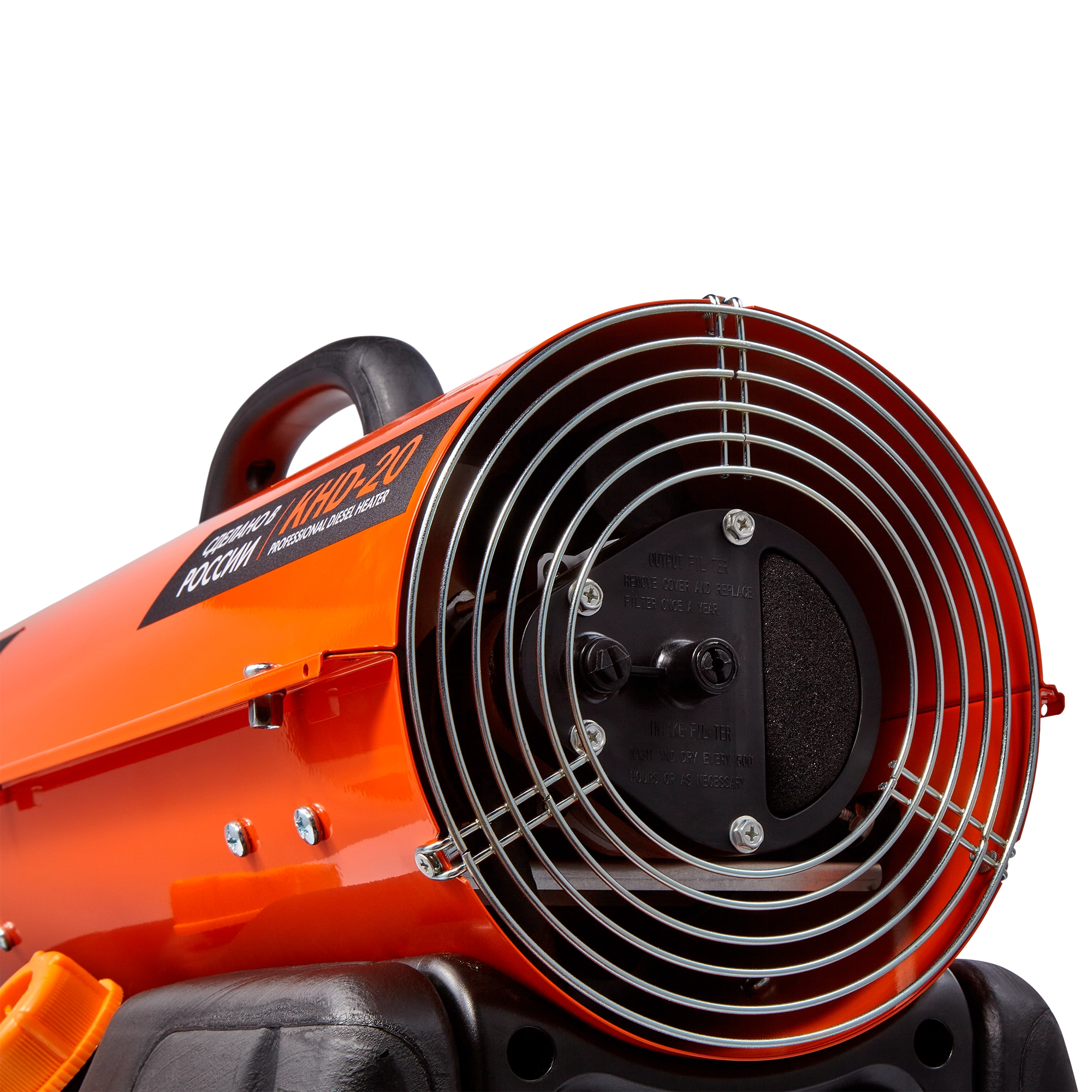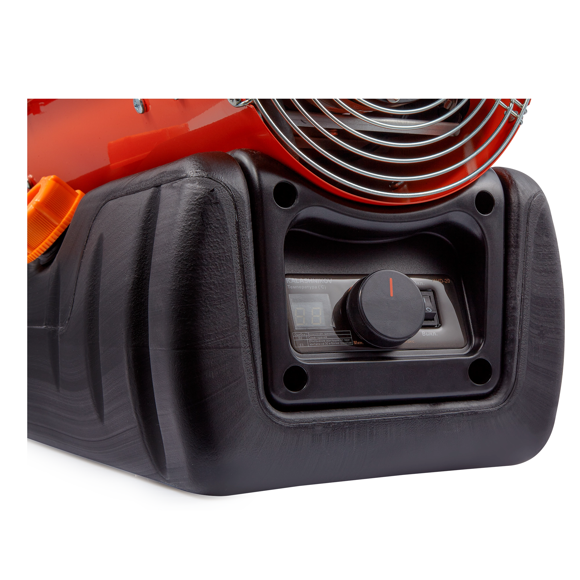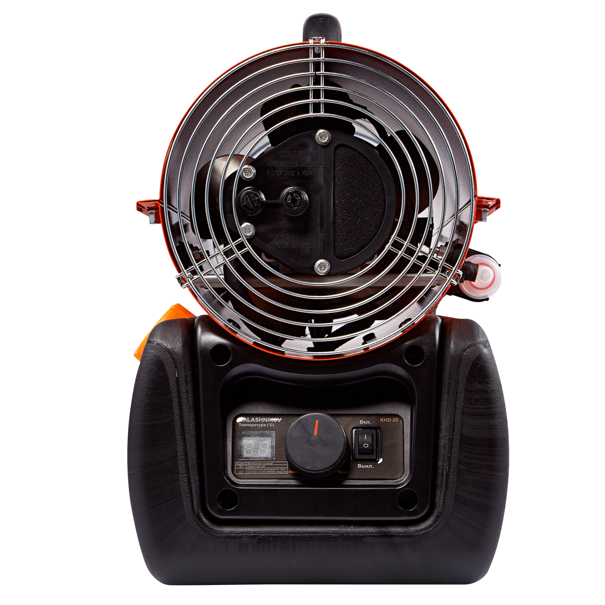 Безопасность использования дизельной тепловой пушки KALASHNIKOV KHD-20 обеспечивает электронная плата управления при помощи температурного датчика и фотоэлемента, контролирующего наличие пламени – прекращает работу прибора при возникновении аварийной ситуации.