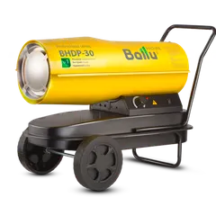 Воздухонагреватель дизельный прямого нагрева Ballu BHDP-30 серии Tundra предназначен для обогрева нежилых помещений и локального прогрева рабочих поверхностей. Тепловая мощность прибора составляет 30 кВт. При работе дизельной пушки воздушный поток, проходя через защитную решётку – втягивается в камеру сгорания. Там он смешивается с распылённым форсункой дизельным топливом, которое при помощи мощного насоса под высоким давлением подаётся из топливного бака, образуя воздушно – топливную смесь. При помощи 12kV электродов смесь поджигается и сгорает, а затем - выбрасывается наружу, смешиваясь с продуктами сгорания и с основной массой поступаемого воздуха, тем самым нагревая его. Теплоотражающий экран, расположенный в передней торцевой части корпуса прибора- служит препятствием для вырывающегося открытого пламени и обеспечивает равномерный прогрев помещения либо обогреваемой рабочей поверхности.