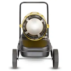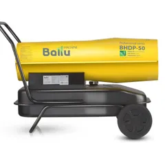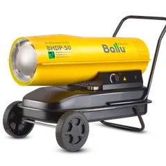 Воздухонагреватель дизельный прямого нагрева Ballu BHDP-50 серии Tundra предназначен для обогрева нежилых помещений и локального прогрева рабочих поверхностей. Тепловая мощность прибора составляет 50кВт. При работе дизельной пушки воздушный поток, проходя через защитную решётку – втягивается в камеру сгорания. Там он смешивается с распылённым форсункой дизельным топливом, которое при помощи мощного насоса под высоким давлением подаётся из топливного бака, образуя воздушно – топливную смесь. При помощи 12kV электродов смесь поджигается и сгорает, а затем - выбрасывается наружу, смешиваясь с продуктами сгорания и с основной массой поступаемого воздуха, тем самым нагревая его. Теплоотражающий экран, расположенный в передней торцевой части корпуса прибора- служит препятствием для вырывающегося открытого пламени и обеспечивает равномерный прогрев помещения либо обогреваемой рабочей поверхности.