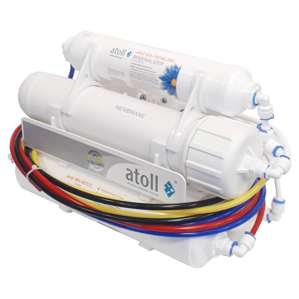 - Atoll CK-5633C - удаляет хлор - Мембрана atoll TW40-1812-75 – представляет из себя полупроницаемый материал, через который могут пройти только молекулы воды и кислорода. Загрязнение фильтрующей поверхности мембраны необратимо и приводит к полной остановке процесса очистки воды. Поэтому применяется предварительная двухступенчатая фильтрация поступающей воды, а работа мембраны организована так, что все поступающие к ней загрязнения не оседают на ее поверхности, а смываются в канализацию.