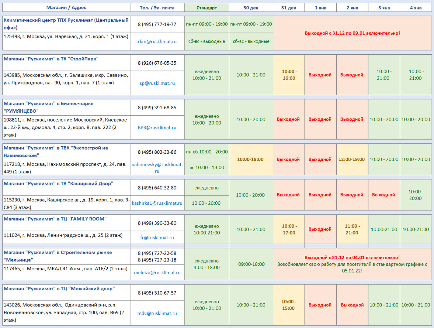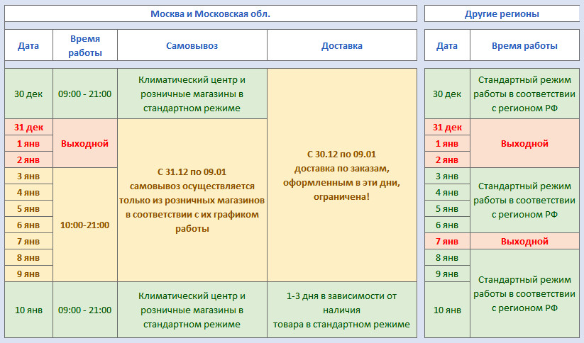 График работы магазинов «Русклимат» в новогодние праздники 2021-2022