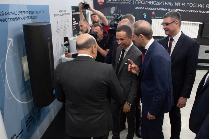 Премьер-министр обратил особое внимание на управляемые дистанционно бойлеры и «умные» панельные радиаторы Royal Thermo, которые получили мировое признание, завоевав в 2021 году престижную премию Red Dot Design. Михаил Мишустин сказал, что хотел бы видеть такие изделия в Доме Правительства РФ. Денис Мантуров внимательно изучил образцы тепловой техники, каркасно-панельные установки, чиллеры и конвекторы Apollo, отметив инновационные технологии, которые используются при их производстве.