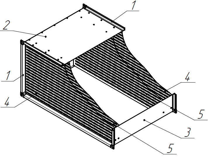 Уникальный выравниватель потока: 1 — фланец, 2, 3 — корпус, 4 — внешние перфорированные пластины, 5 — внутренние перфорированные пластины