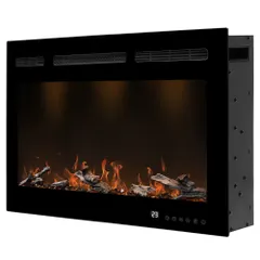 Современный электроочаг с декоративным наполнением из акриловых кристаллов и дров, палитра подсветки которых включает 6 оттенков основного пламени и режим тлеющих дров, 5 уровней настройки скорости пламени.
