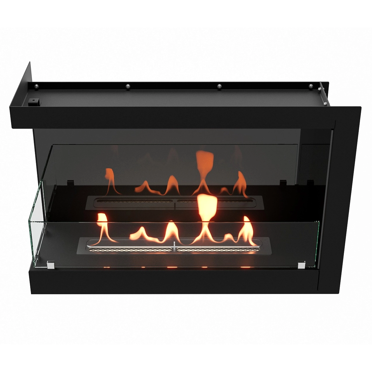 Представляют сборную металлическую конструкцию, способную создать полуоткрытое безопасное пространство для огня c топливным блоком ограниченную закаленным стеклом с двух сторон.