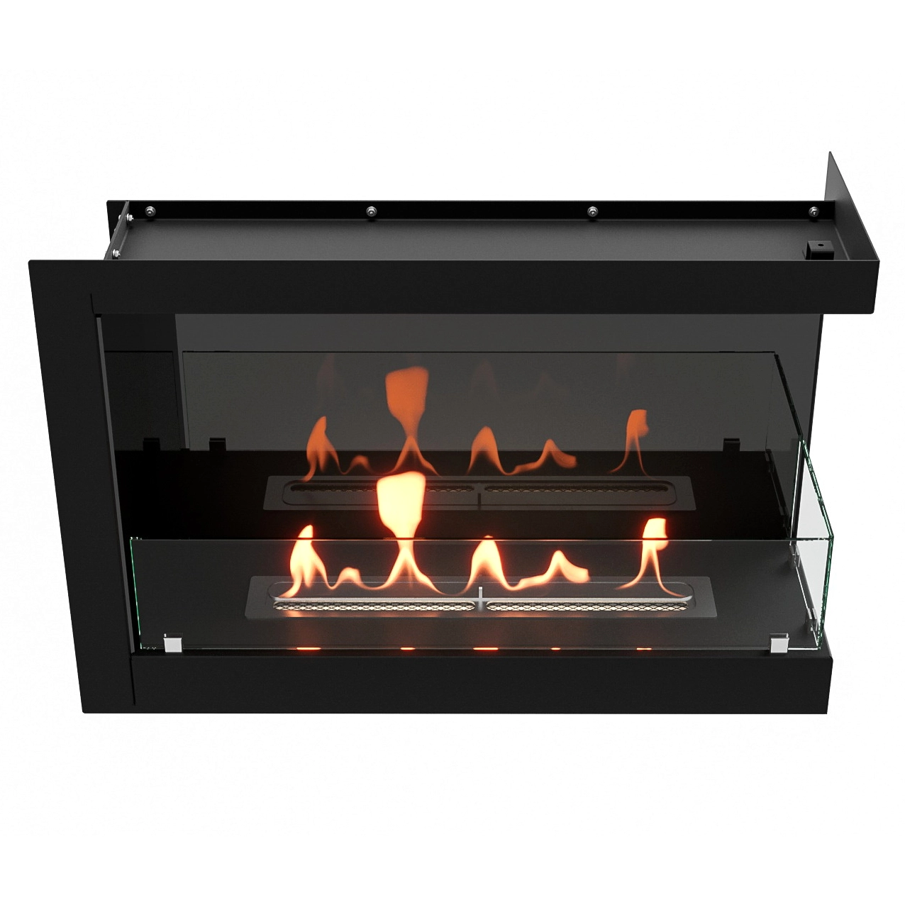 Представляют сборную металлическую конструкцию, способную создать полуоткрытое безопасное пространство для огня c топливным блоком  ограниченную закаленным стеклом с двух сторон.