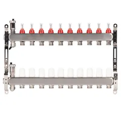 Коллекторы Royal Thermo поступают в сборе и включают подающий и обратный коллекторы, регулировочные вентили с встроенными расходомерами, термостатические вентили с возможностью установки сервопривода, воздухоотводчики и сливные краны и заглушки.