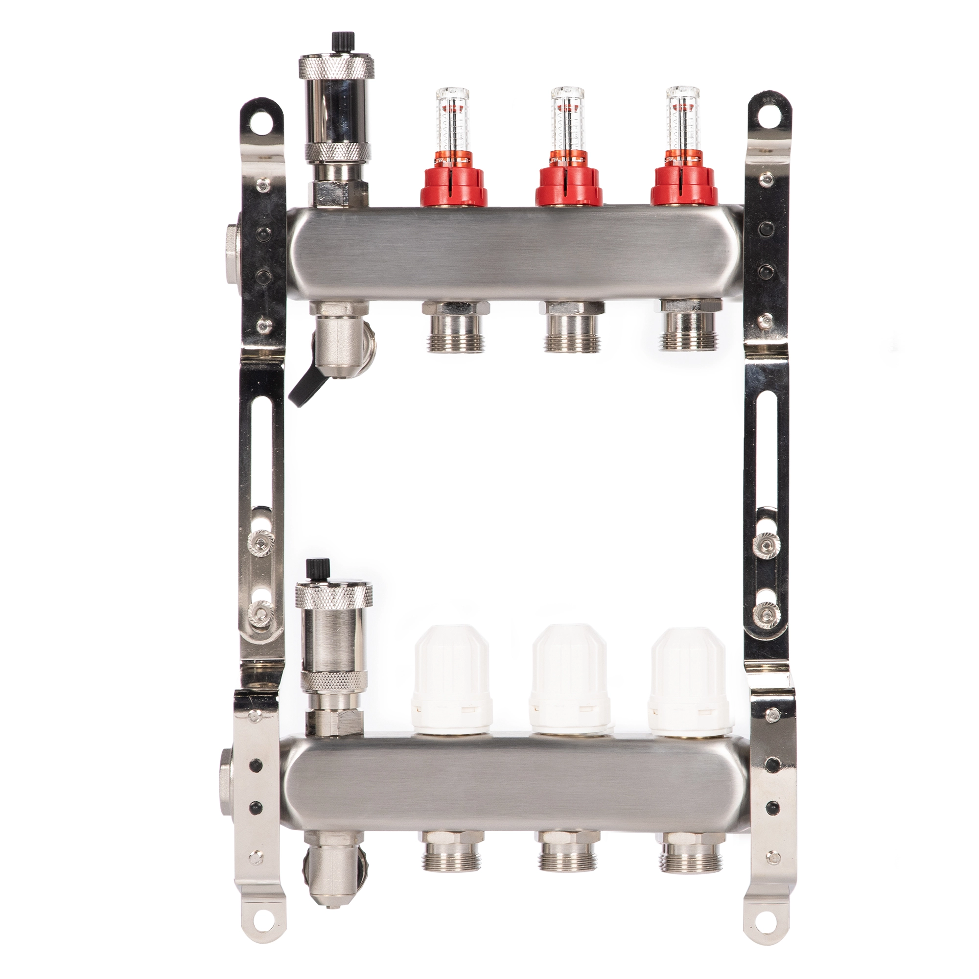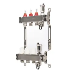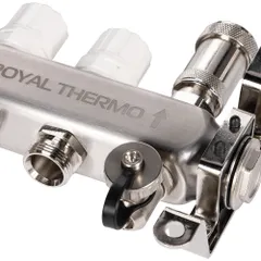 Коллекторы Royal Thermo поступают в сборе и включают подающий и обратный коллекторы, регулировочные вентили с встроенными расходомерами, термостатические вентили с возможностью установки сервопривода, воздухоотводчики и сливные краны и заглушки.
