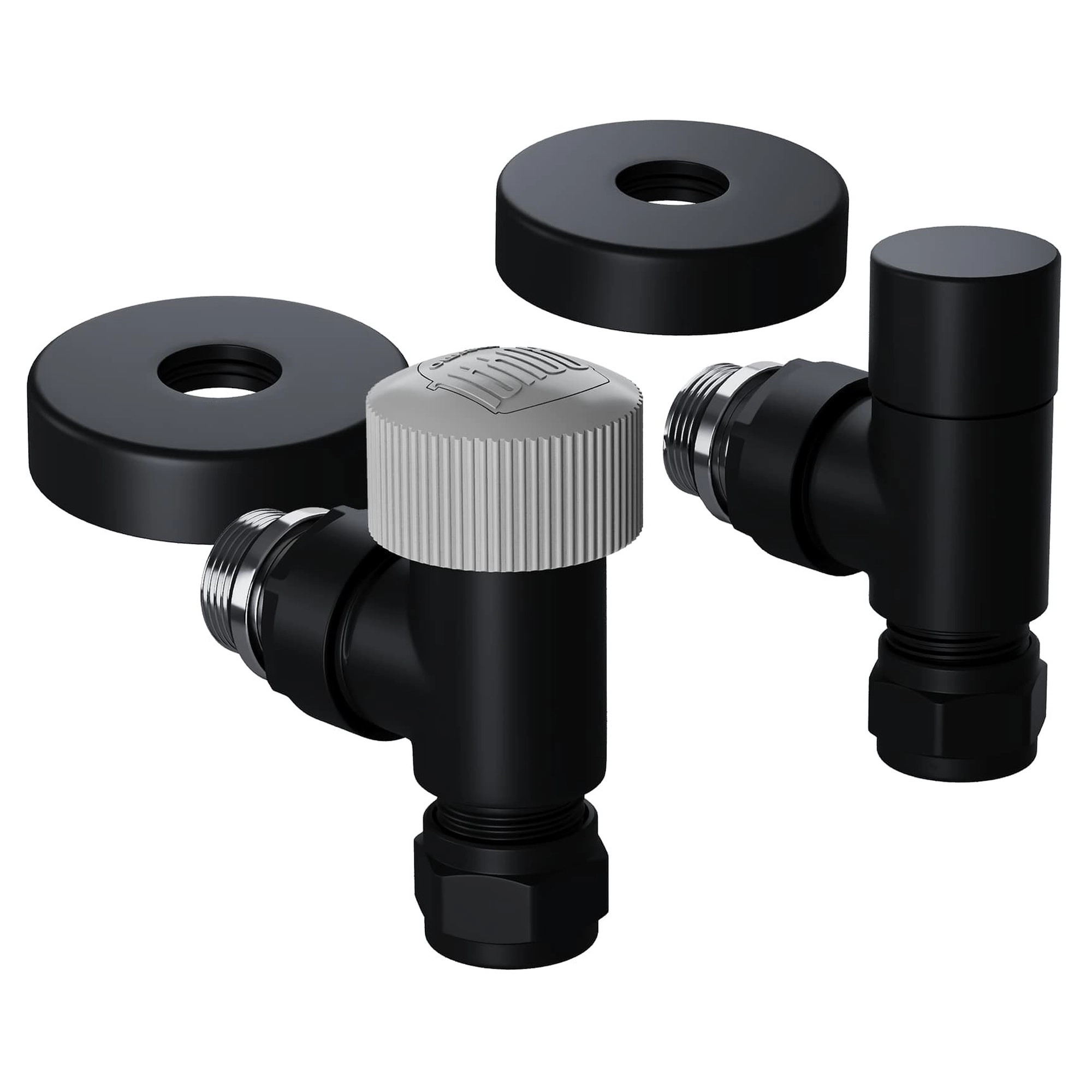 Термостатические наборы серии Design Pro поставляется в необходимой для чистового монтажа комплектации: клапан термостатический для установки на подающий трубопровод, запорный клапан для установки на обратный трубопровод, 2 гайки-фитинга для подключения клапанов к монтажной трубке 15 мм и 2 цельных латунных отражателя с внутренним резиновым уплотнением внутренним диаметром 15,2 мм.