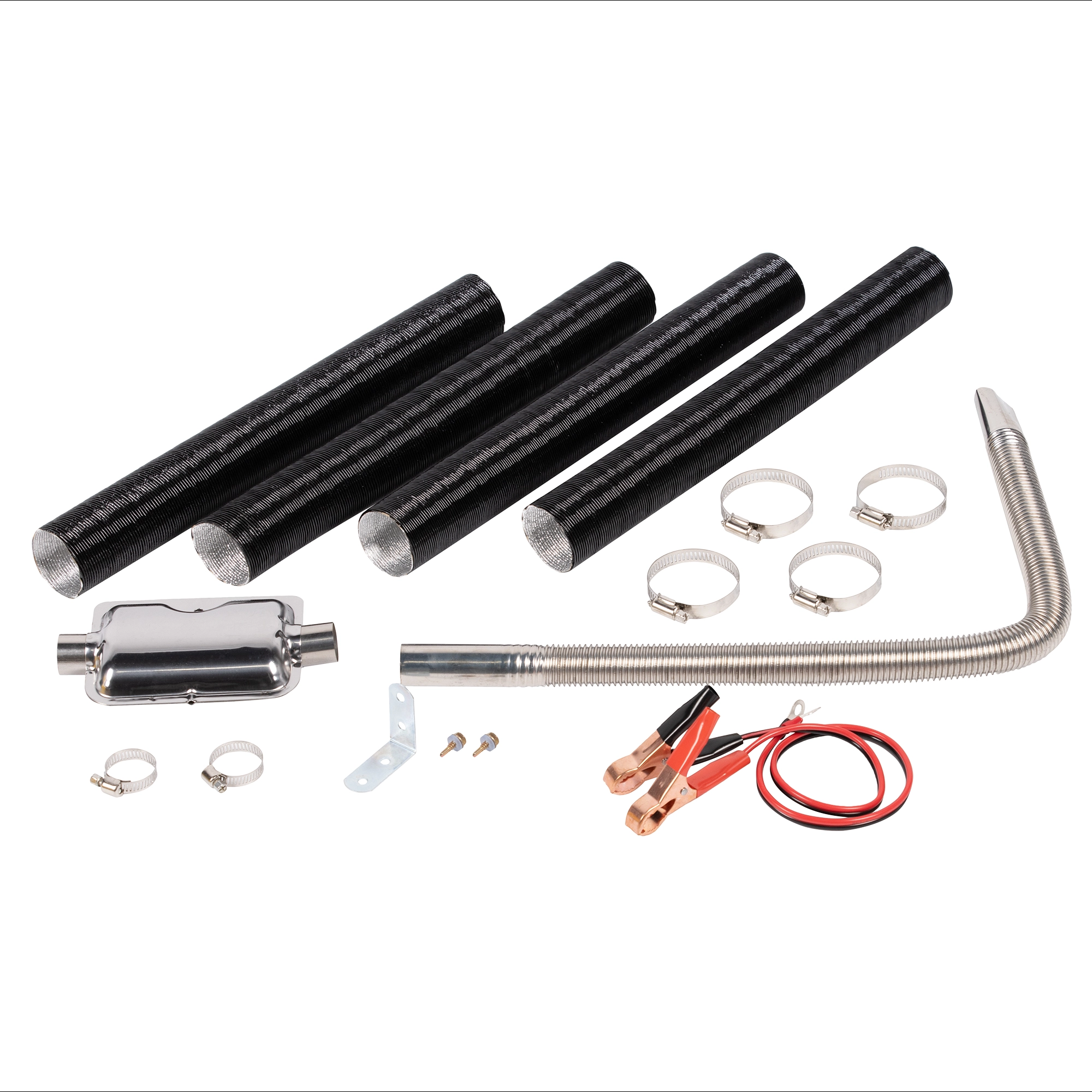 Самая полная комплектация (провода для подключения к аккумулятору, труба дымохода, гофротрубы 4 шт., хомуты, глушитель)