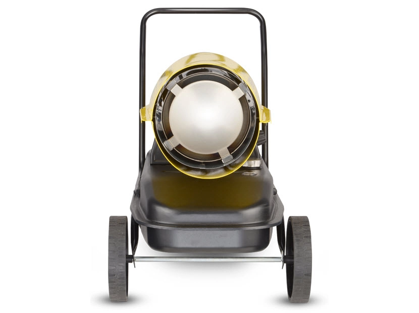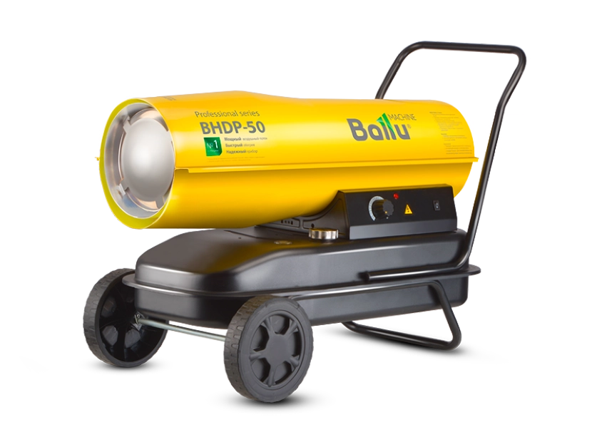 Воздухонагреватель дизельный прямого нагрева Ballu BHDP-50 серии Tundra предназначен для обогрева нежилых помещений и локального прогрева рабочих поверхностей. Тепловая мощность прибора составляет 50кВт. При работе дизельной пушки воздушный поток, проходя через защитную решётку – втягивается в камеру сгорания. Там он смешивается с распылённым форсункой дизельным топливом, которое при помощи мощного насоса под высоким давлением подаётся из топливного бака, образуя воздушно – топливную смесь. При помощи 12kV электродов смесь поджигается и сгорает, а затем - выбрасывается наружу, смешиваясь с продуктами сгорания и с основной массой поступаемого воздуха, тем самым нагревая его. Теплоотражающий экран, расположенный в передней торцевой части корпуса прибора- служит препятствием для вырывающегося открытого пламени и обеспечивает равномерный прогрев помещения либо обогреваемой рабочей поверхности.