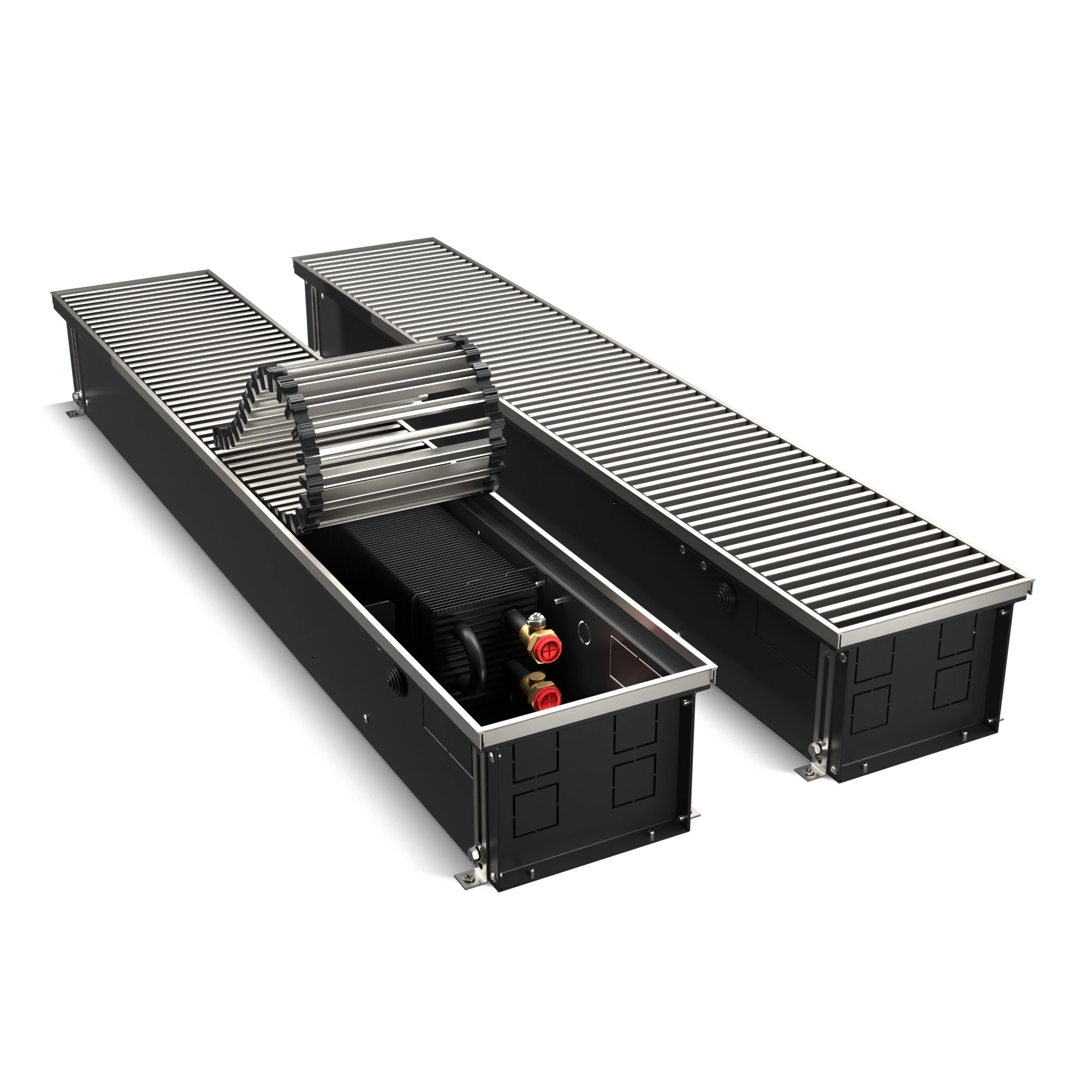 Корпус окрашен шагреневой краской AkzoNobel фирменного черного цвета Noir Sable. В такой же цвет окрашен теплообменник. Темная окраска корпуса изнутри и декоративные крышки, защищающие зону подключения и зону калача от попадания пыли и мусора, визуально скрывают внутреннюю часть, благодаря чему конвектор эстетично смотрится в интерьере.