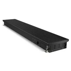 Корпус окрашен шагреневой краской AkzoNobel фирменного черного цвета Noir Sable. В такой же цвет окрашен теплообменник. Темная окраска корпуса изнутри и декоративные крышки, защищающие зону подключения и зону калача от попадания пыли и мусора, визуально скрывают внутреннюю часть, благодаря чему конвектор эстетично смотрится в интерьере.