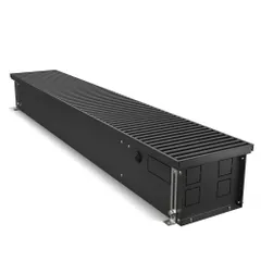 Корпус окрашен шагреневой краской AkzoNobel фирменного черного цвета Noir Sable. В такой же цвет окрашен теплообменник. Темная окраска корпуса изнутри и декоративные крышки, защищающие зону подключения и зону калача от попадания пыли и мусора, визуально скрывают внутреннюю часть, благодаря чему конвектор эстетично смотрится в интерьере.