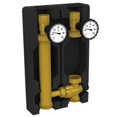 Сведения об изделии Насосные группы RTE 54.103 с поддержанием фиксированной температуры предназначены для циркуляции теплоносителя, поступающего из нагревателя, и одновременного поддержания устанавливаемой температуры линии подачи. Регулирование температуры осуществляется автоматическим подмесом теплоносителя из обратной линии. Управление осуществляется с помощью термостатического клапана. Группы с фиксированной температурой на подаче предназначены для использования в контурах, в которых требуется автоматическое поддержание температуры подающей линии, таких как – радиаторное отопление, теплые полы и др. Насосные группы RTE 54.103 поставляются в собранном виде, в изоляции. Принцип действия Насосная группа с термостатическим смесительным клапаном представляет собой готовый комплект арматуры и насоса (опционально), предназначенный для выполнения функции циркуляции теплоносителя в контуре, c возможностью дополнительной регулировки температуры жидкости, путём подмеса теплоносителя из обратной линии. Комплект рассчитан на работу при максимальном давлении 10 бар и температуре теплоносителя 110 °С. Подключение к контуру нагревателя (котла), 1 ½” наружная резьба, находится снизу. Подключение к контуру потребителя ,1” внутренняя резьба, располагается сверху. Конструкция 1. Термометр синий – обратная линия, шкала температур от 0 до 120 °С ; 2. Термометр красный – подающая линия, шкала температур от 0 до 120 °С ; 3. Термостатический смесительный клапан; 4. Накидные гайки для подключения насоса 1 ½” НГ; 5. Патрубок обратной линии; 6. Блочная ЕРР теплоизоляция; 7. Обратный клапан; 8. Подключение к контуру потребителя 1” ВР 9. Подключение к контуру нагревателя (котла) 1 1/2” НР