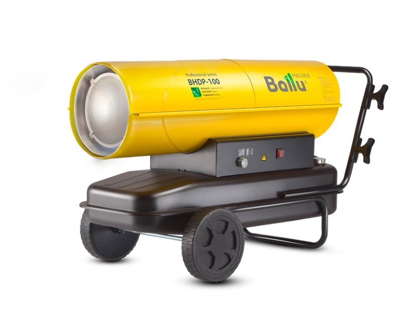 Воздухонагреватель дизельный прямого нагрева Ballu BHDP-100 серии Tundra предназначен для обогрева нежилых помещений и локального прогрева рабочих поверхностей. Тепловая мощность прибора составляет 100кВт. При работе дизельной пушки воздушный поток, проходя через защитную решётку – втягивается в камеру сгорания. Там он смешивается с распылённым форсункой дизельным топливом, которое при помощи мощного насоса под высоким давлением подаётся из топливного бака, образуя воздушно – топливную смесь. При помощи 12kV электродов смесь поджигается и сгорает, а затем - выбрасывается наружу, смешиваясь с продуктами сгорания и с основной массой поступаемого воздуха, тем самым нагревая его . Теплоотражающий экран, расположенный в передней торцевой части корпуса прибора- служит препятствием для вырывающегося открытого пламени и обеспечивает равномерный прогрев помещения либо обогреваемой рабочей поверхности.