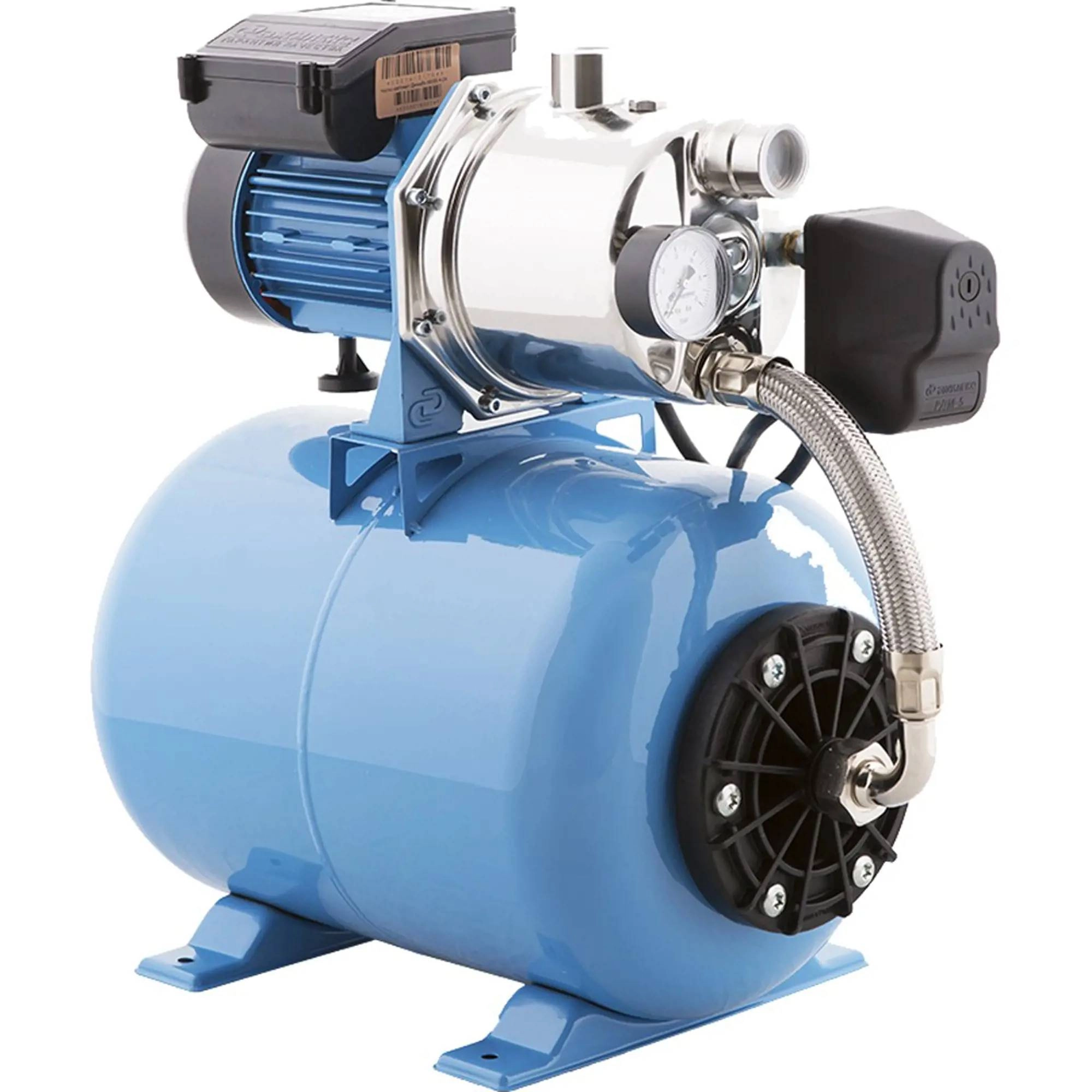 Насосная станция укомплектована поверхностным самовсасывающим электронасосом, горизонтальным гидроаккумулятором емкостью 24 литра, реле давления, манометром, соединительной арматурой и электрошнуром с вилкой.