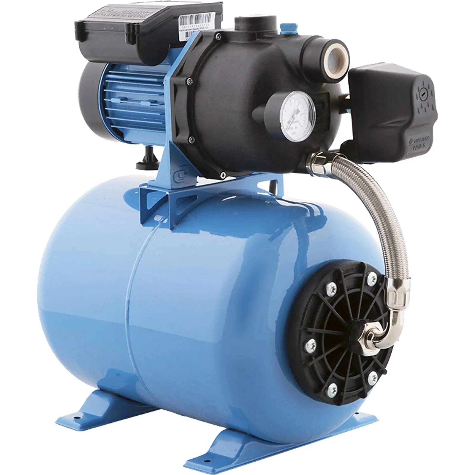 Насосная станция укомплектована поверхностным самовсасывающим электронасосом, горизонтальным гидроаккумулятором емкостью 24 литра, реле давления, манометром, соединительной арматурой и электрошнуром с вилкой.