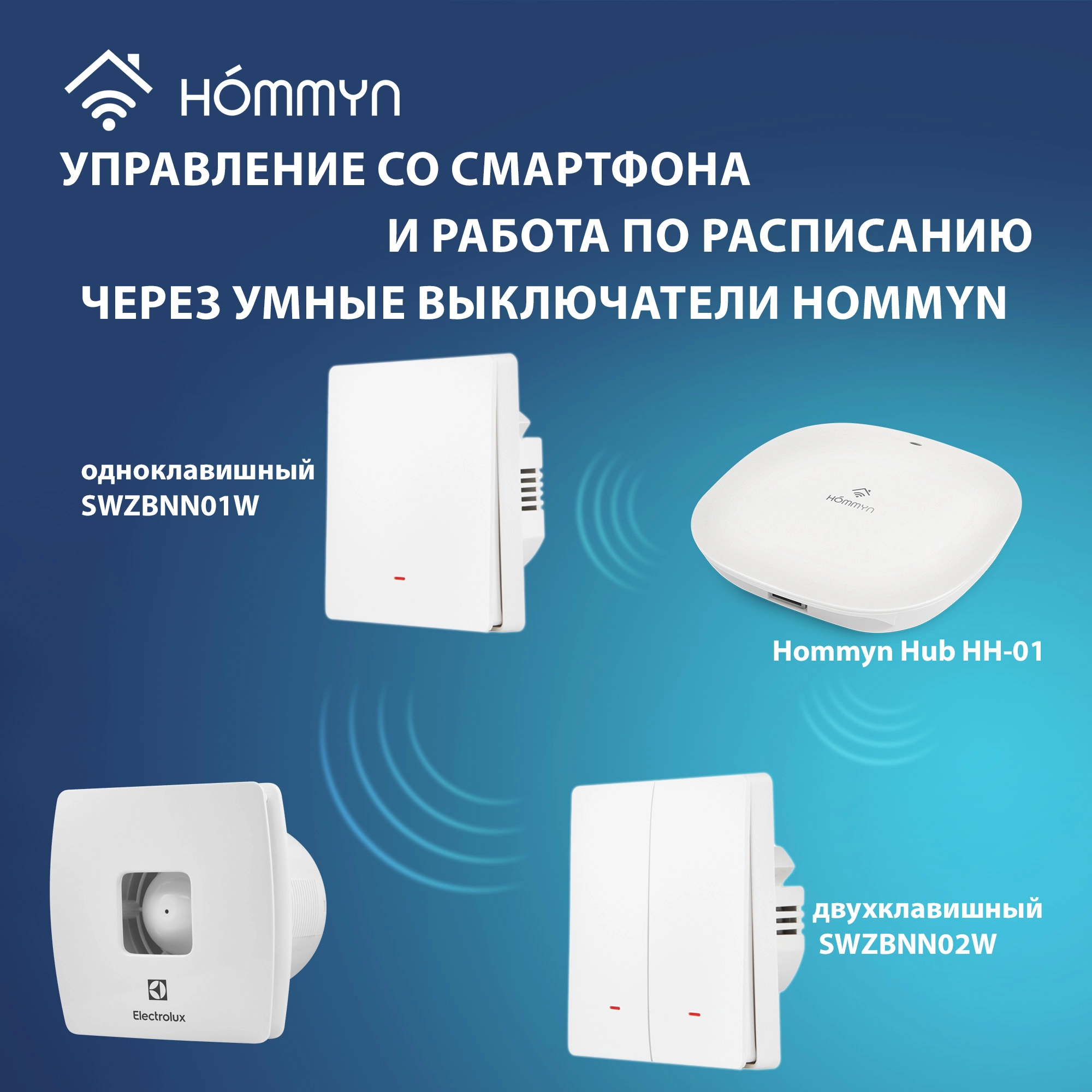 Для управления вытяжным вентилятором со смартфона и настройки работы по расписанию необходимо подключить его через умный выключатель или реле Hommyn! при необходимости установить Блок управления (шлюз) HOMMYN
