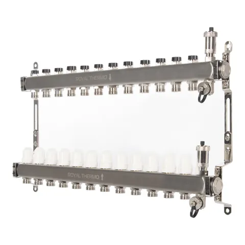 Применяются в качестве распределителя теплоносителя в контуры теплого пола. Для удобства балансировки системы напольного отопления на коллектор установлены расходомеры для визуального контроля и необходимой регулировки расхода теплоносителя в отдельных контурах теплого пола.