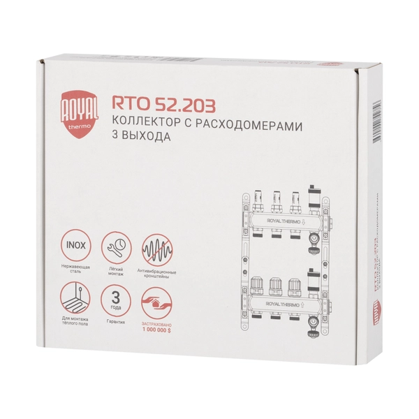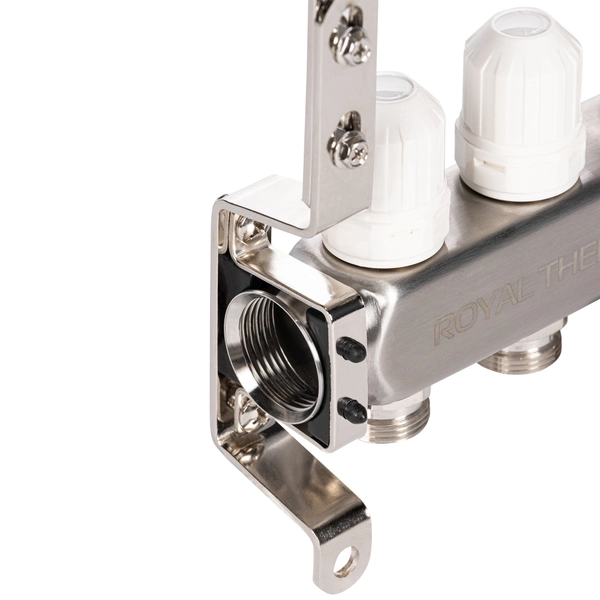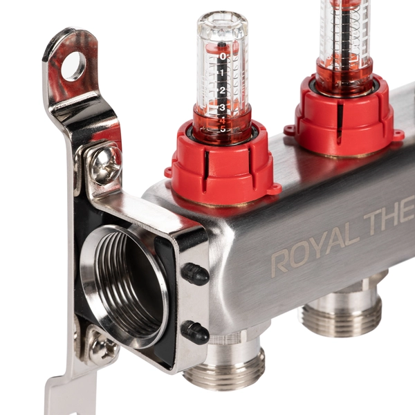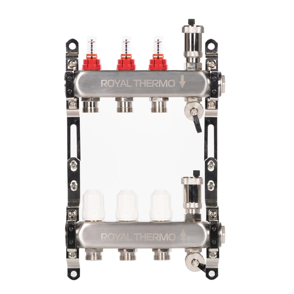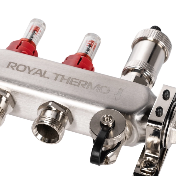 Коллекторы Royal Thermo поступают в сборе и включают подающий и обратный коллекторы, регулировочные вентили с встроенными расходомерами, термостатические вентили с возможностью установки сервопривода, воздухоотводчики и сливные краны и заглушки.