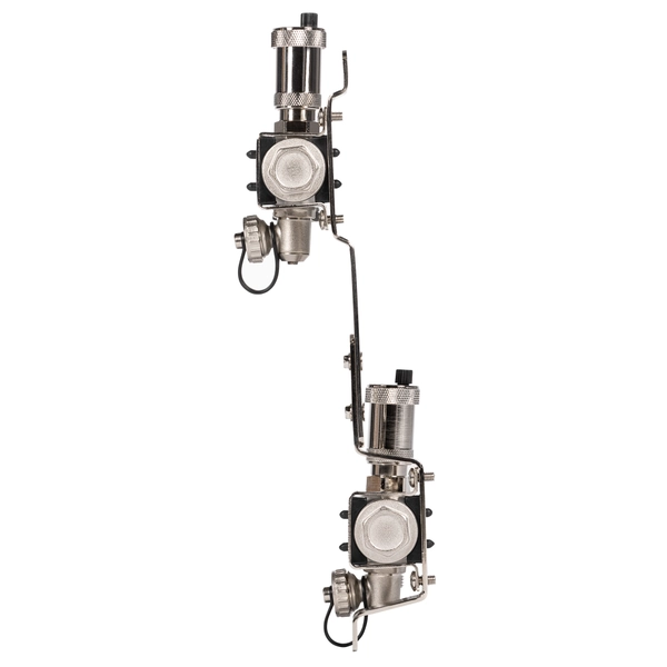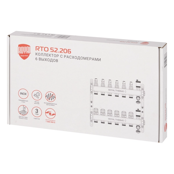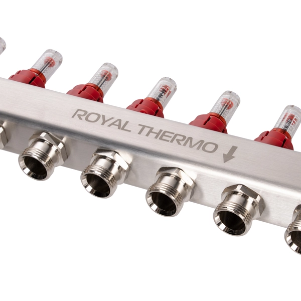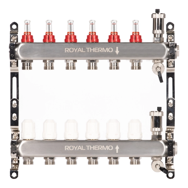 Коллекторы Royal Thermo поступают в сборе и включают подающий и обратный коллекторы, регулировочные вентили с встроенными расходомерами, термостатические вентили с возможностью установки сервопривода, воздухоотводчики и сливные краны и заглушки.
