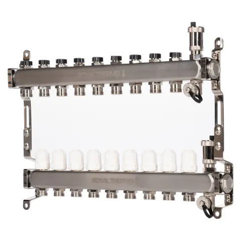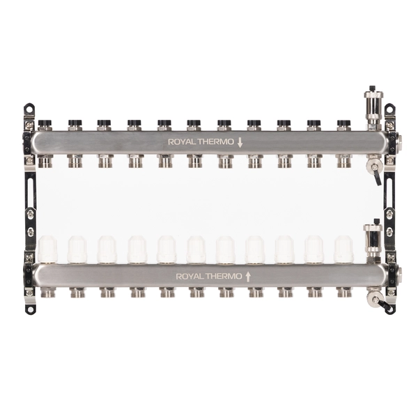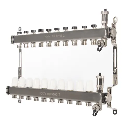 Универсальный коллектор из нержавеющей стали Royal Thermo предназначен для распределения теплоносителя в системах отопления и водяного теплого пола.
