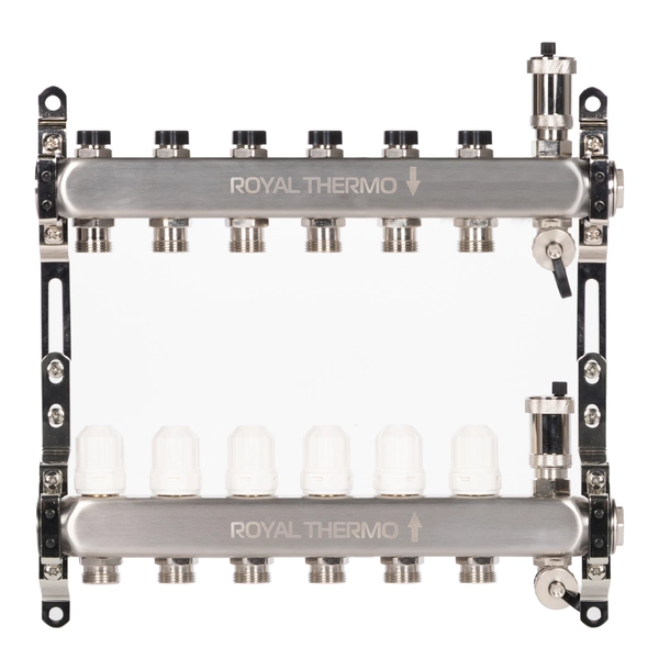 Универсальный коллектор из нержавеющей стали Royal Thermo предназначен для распределения теплоносителя в системах отопления и водяного теплого пола.