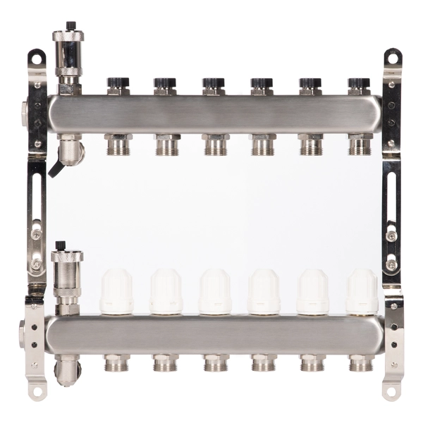 Благодаря удобной конструкции – коллектор легко монтировать и обслуживать. А применение высококачественной нержавеющей стали марки AISI 304 для производства коллектора позволяет защитить прибор от воздействия коррозии. Наличие нескольких выходов дает возможность подключить сразу несколько контуров.