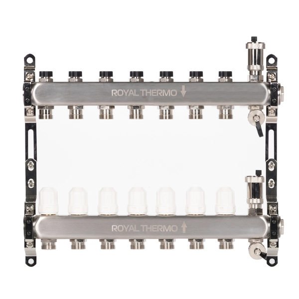 Универсальный коллектор из нержавеющей стали Royal Thermo предназначен для распределения теплоносителя в системах отопления и водяного теплого пола.