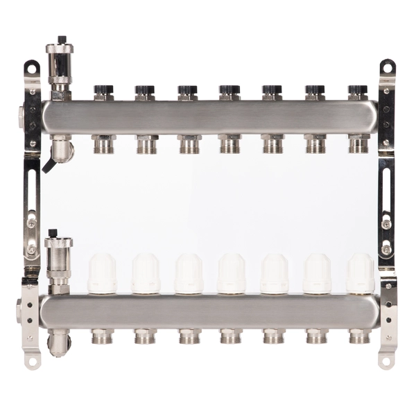 Благодаря удобной конструкции – коллектор легко монтировать и обслуживать. А применение высококачественной нержавеющей стали марки AISI 304 для производства коллектора позволяет защитить прибор от воздействия коррозии. Наличие нескольких выходов дает возможность подключить сразу несколько контуров.