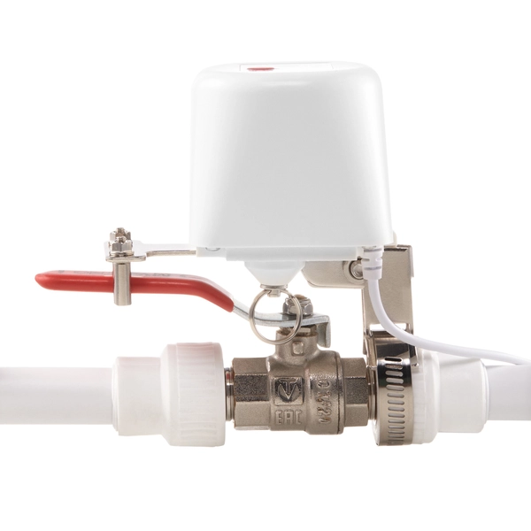 Установите манипулятор на кран подачи воды на трубопроводе домашней системы водоснабжения. Надежно зафиксируйте манипулятор, плотно затянув хомут на трубе и Т-образное крепления на рычаге шарового крана*. Подключите устройство к питанию через адаптер (входит в комплект).